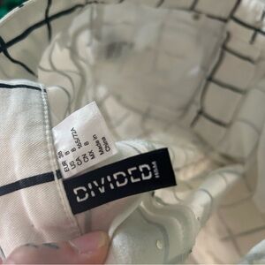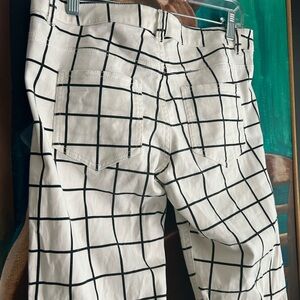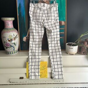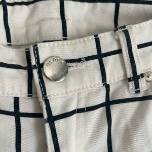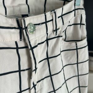Chic white pants with a bold black grid design. Ideal for versatile styling.