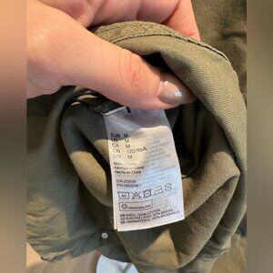 Divided by H&M olive green shacket in size medium, lightweight shirt jacket perfect for fall layering and casual street style. Women’s olive jacket ideal for everyday outfits, neutral outerwear, transitional weather, and relaxed wardrobe staples. Trendy H&M shacket great for layering over tees or sweaters.