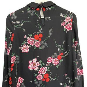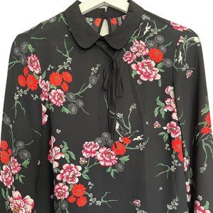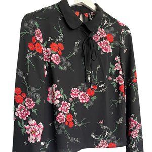 Patterned blouse in airy chiffon with a rounded collar with sewn-in ties at the front. Opening with a button at the back of the neck and long sleeves with buttoned cuffs.