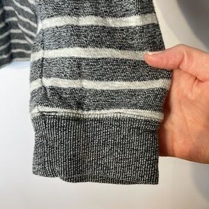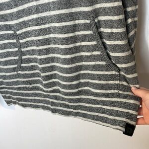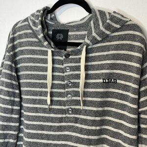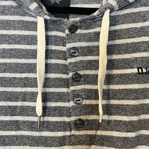 In good second hand condition. 100% cotton. Stripes with drawstring hood. Front half buttons. Logo embroidered on the front. Measure lay flat: shoulder 21’’ bust 23’’ length 29’’ sleeve length 26’’.