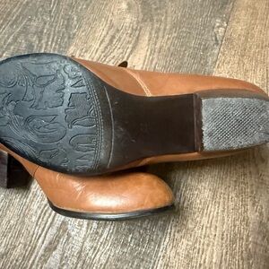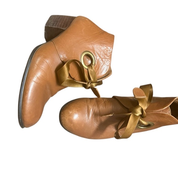 Django and Juliette 7.5 good to great condiyonky minor wear around heel.. ribbon laced almost victorian vibes or even bohemian/ but classic for sure! Elevate your wardrobe with these elegant tan ankle boots. Featuring a stylish gold accent, they are perfect for any occasion.