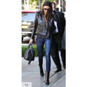 Edgy-chic tonal moto panels over knees.