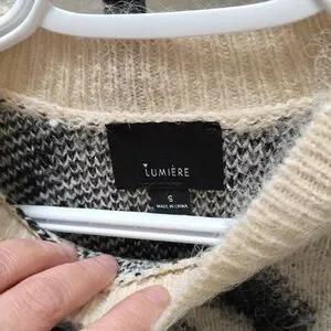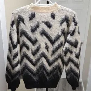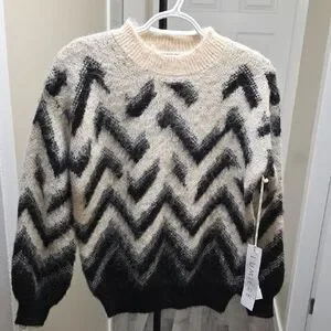 Brand new with tags Lumiere fuzzy knit sweater featuring a bold chevron zigzag pattern in cream and black with a soft ombre fade toward the hem. Ultra cozy brushed texture with ribbed neckline, cuffs, and hem.