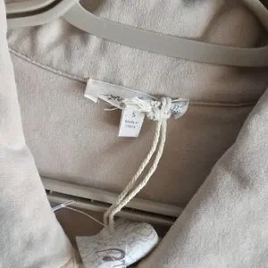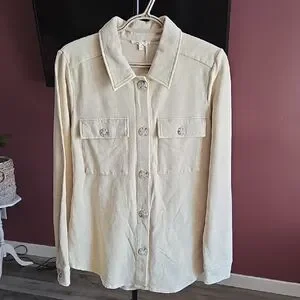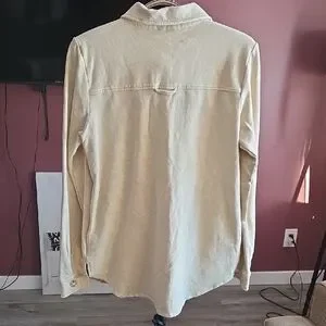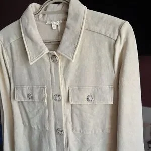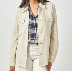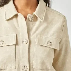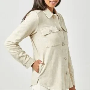 Brand new with tags Mystree creamy beige acid wash shacket jacket featuring a soft sweatshirt-like fabric for cozy layering. Designed with a relaxed button-up front, classic collar, and dual chest pockets for a casual utility style. The neutral creamy beige tone makes it easy to pair with denim, leggings, or layered over dresses for an effortless everyday look.