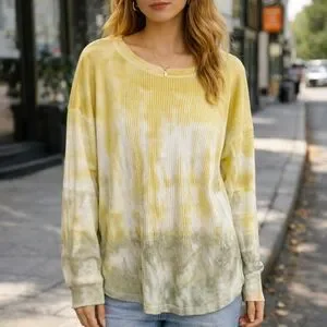 The textured waffle knit adds dimension while the tie-dye pattern gives it a trendy boutique style. Easy to pair with jeans, leggings, denim shorts, or layered under jackets and cardigans for a relaxed everyday outfit.