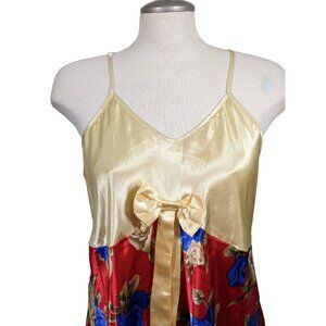 Womens Silky Sleep Dress Nightie Size Large Floral Roses Bow Ruffle Hem Gold Red Blue Adjustable Straps