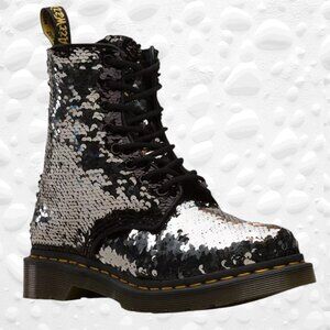 The 1460 Pascal is an 8-eye silhouette based on the original Dr. Martens boot. The boot's iconic DNA looks like this: 8-eyes, an air-cushioned sole with grooved edges, visible welt stitching and a heel-loop. This season, the women's boot takes it up a notch — in eye-catching, party-ready flip sequins that go from black to silver. Even better the color continues throughout subtle detail.