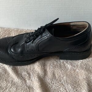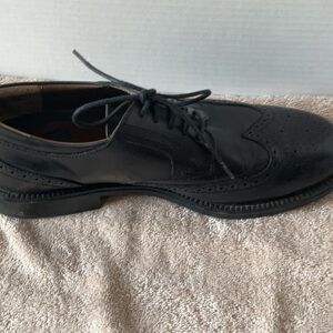 Experience timeless elegance with Dockers black leather oxfords, showcasing intricate wingtip detailing and a polished finish. These shoes are crafted for formal occasions, offering a classic style with a durable sole and decorative brogue patterns.