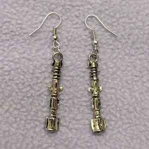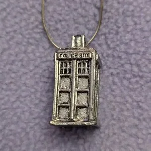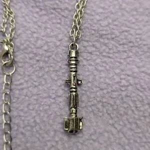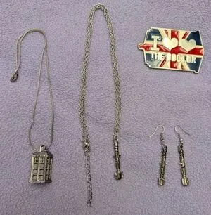 Jewelry set featuring Doctor Who themed designs. Includes a TARDIS necklaces, a sonic screwdriver necklace, and a pair of sonic screwdriver earrings.