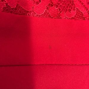This is a gorgeous vibrant red sweetheart and lace fit/flare dress from Doe & Rae in size small. It’s a polyester but breaths very nicely.