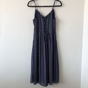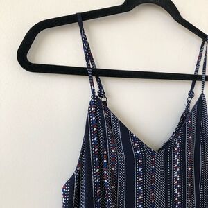 Gaucho pants jumpsuit that ends below the knee. Lace-up back detail and zipper closure. Adjustable spaghetti straps. Fully lined polka dot chiffon fabric