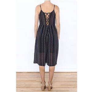 Gaucho pants jumpsuit that ends below the knee. Lace-up back detail and zipper closure. Adjustable spaghetti straps. Fully lined polka dot chiffon fabric