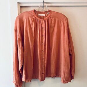 Beautiful Jane blouse from Doen in the colour Petal (quite rare), size XS - could fit a size S also. The colour is a pink-peach and resembles the last two photos the most. Like most Doen Jane blouses, this one is semi-sheer. My kitten snagged a couple of tiny holes which are not noticeable when worn (see last two photos).