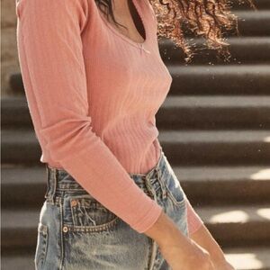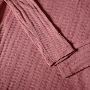 Elegant ribbed top with scoop neckline. Features long sleeves and delicate bow detail. Ideal for layering or casual wear.
