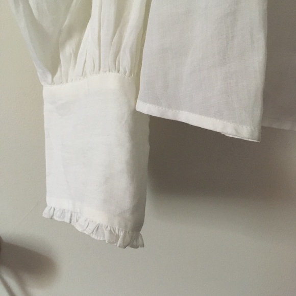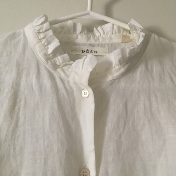Gorgeous billowy white blouse by Doen. Features ruffled collar and cuffs. Button-down front. Mother of pearl buttons. I love it but not reaching for it enough and ready to pass along.