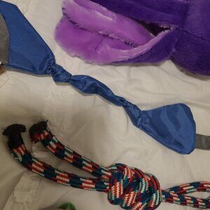 Great bundle of tug toys, leashes, & a cute dog hat/lion's mane for for bigger dogs. Octopus has crinkled noise stuff & it's like new- brand name is Outward Hound.