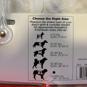 Orange Flotation Life Jacket in size XS (5-15 lbs; Girth 11-15 inches). Has Ripstop material that is strong and breathable; Rescue handles and reflective piping for visibility; Thick foam for maximum buoyancy; Full belly band for secure fit.