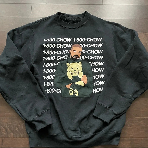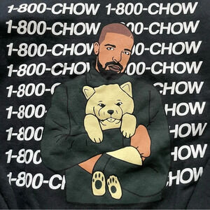 1-800-Chow Black men’s small crewneck sweatshirt featuring Drake holding a dog.