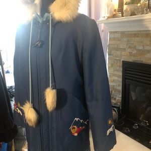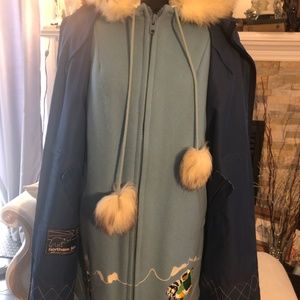 Materials: virgin wool, embroidered art, inuit art, waterproof windproof, 3 in 1 parka, fox fur ruff, fox pom poms, double zippers