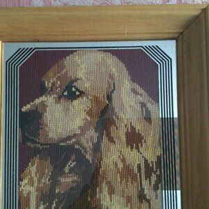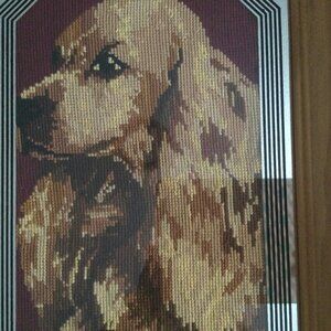 It is a dog portrait needlework fabric in a wooden glass-covered frame.