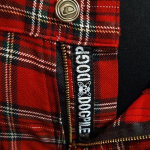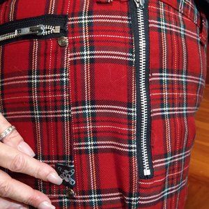 Amazing pair of dogpile red tartan pants alot of zippers all working one bondage strap great condition 19 waist across 12 rise 40 long