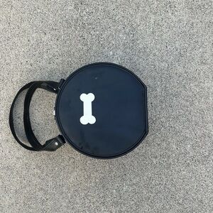 Carry their on-the-go water and food with style. Stylish black round bag featuring a white bone design. Perfect for a unique look.