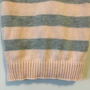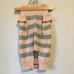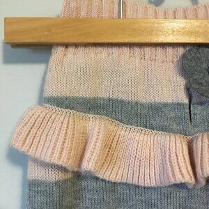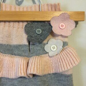 Very good preowned condition doggy sweater for a medium/small dog featuring grey and pink alternating stripes, gilly frills and felt flowers with matching buttons. Aw. So sweet. There's a little hole in the back for a leash. The tags have been cut out, so I'm unsure of the exact size or brand. It's got some stretch, all the same, be sure to compare measurements in the photos with your own canine friend. Perfect for Winter walks or downtown struts.