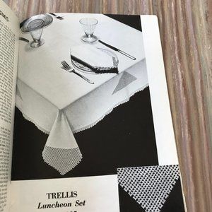 Vintage from 1940 "Doilies: Luncheon Sets - Table Runners" booklet #1474 by The Canadian Spool Cotton Company. Create tablecloths, luncheon sets, tray cloths and more using the motifs from this booklet. Black & white photographs illustrate finished items. Vintage condition: paper cover has heavy wear with masking tape on the spine edge, back cover has a large tear with partial tape, creasing to page edges. No missing pages. 30 pages, 7 3/4" x 10 3/4".