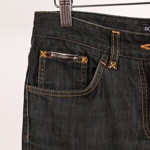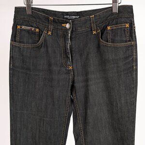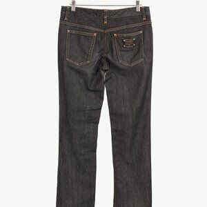 Made in Italy, these jeans from Dolce & Gabbana circa the late 2000's are crafted with a slight-stretch cotton-blend denim in a charcoal grey wash, and feature a front button and zip fly closure, belt loops, front curved and change pockets, back patch pockets with a leather-trim logo plaque on the right, straight-cut legs, and contrast topstitching.