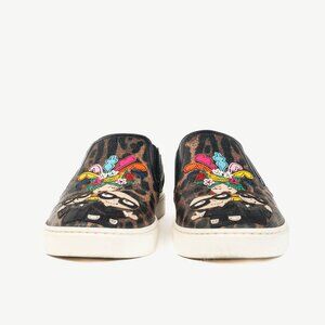 Made in Italy, these DG Family slip-on sneakers from Dolce & Gabbana are crafted in a brown leopard coated canvas, and are embellished with multicolour DG Family appliques. They feature closed rounded toes, black leather trim, elastic gussets, leather lining, and flat rubber outsoles.