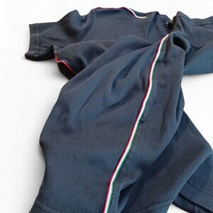 Form fitting and features sleek red, white, and green stripes running along the shoulders and down each side, celebrating Italian craftsmanship. Crafted from a soft, stretchy cotton-spandex blend (95%/5%) for a close, tailored fit. V-neck, short sleeves, black body, and signature external Dolce & Gabbana “Made in Italy” logo plaque with tricolor ribbon on the back.