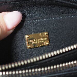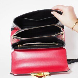 This Dolce & Gabbana structured shoulder bag features smooth red leather with black embossed trim and a bold gold-tone push-lock clasp accented by a signature bee charm. The bag includes a top handle and adjustable shoulder strap for versatile carry. Elegant yet distinctive, it offers both functionality and standout design in excellent condition.