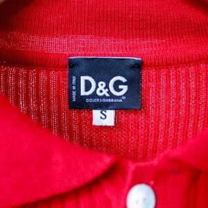 A rare Dolce & Gabbana (D&G) vintage piece, this striking red knit sweater features a classic polo collar with button placket and subtle ribbed texture. The iconic "D&G" logo is knitted into the front, making it a bold yet timeless statement piece.