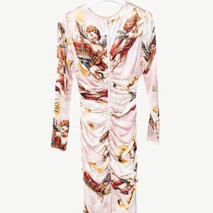 This fitted dress from Dolce & Gabbana's 2018 Spring and Summer collection is crafted with a sleek pink silk satin printed in a distinctively baroque cherub print, and features long sleeves, a round neck, a midi-length hem, a back vent, a concealed back zip closure, and is lined in solid tonal satin.