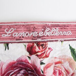 This exquisite Dolce & Gabbana skirt is a standout designer piece featuring a rich floral jacquard pattern, shimmering pink sequin waistband embroidered with “L’amore è bellezza,” and the iconic Dolce & Gabbana signature printed on the front. Fully lined for comfort. Made in Hungary with luxury materials—cotton, silk, and viscose.