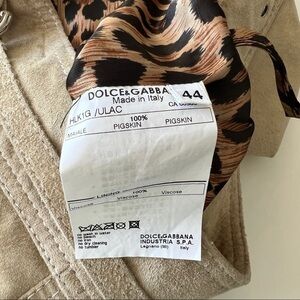 Dolce & Gabbana tan cream suede leather animal print lined mini skirt. Silver buckle D&G logo details front zip button up back tie up.
