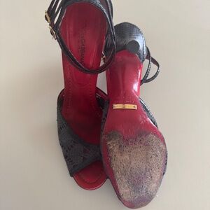 Amazing Vintage Dolce & Gabbana Stiletto Heel. Red satin interior. Snake skin back and straps with a crochet on top of mesh toe. So beautiful and perfect for a summer wedding or date night. Size 37 fits a true 7 or a narrow 7.5.