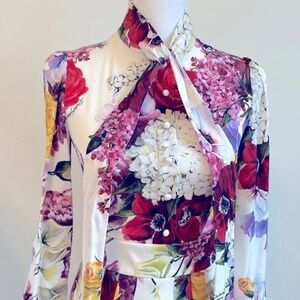 Perfect for special occasions. Vibrant elegant design Dolce & Gabbana silk floral pleated dress. Turtleneck style with “button” snaps at back of neck and cuffs. Size 40, North American equivalent size 4. NWT The bust is 32” with some very slight room for stretch. The waist is 26” with no room for stretch.