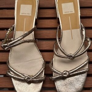 Stylish and modern Dolce Vita sandals featuring a square toe, metallic gold faux leather straps with knotted details, and a chunky block heel. These open-toe slip-ons offer both elegance and comfort, perfect for summer outings or evening wear. The sandals are size 9.