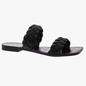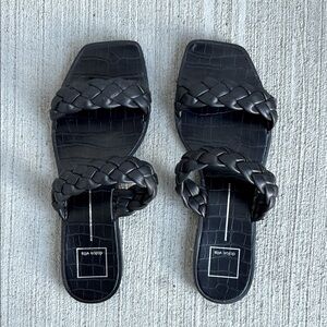 Dolce Vita Indy sandals in black, featuring a braided design on the straps and a flat sole. The sandals are made from synthetic materials with a rubber sole and a slip-on closure. They are designed for comfort and style, suitable for pairing with spring dresses or tailored trousers. The sandals are a heel height of approximately 0.6 inches.