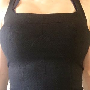 Black D&G sleeveless midi dress with scoop neck, pleated accents at skirt and concealed zip closure at back.