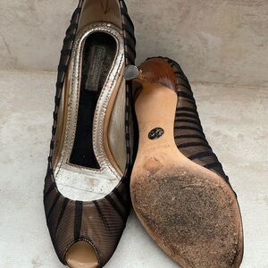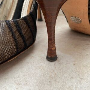 Dolce & Gabbana Black Tulle Pumps. The sheer tulle is fun and flirty, yet the classic silhouette endows these pumps with just the right amount of modesty. The stacked wooden heel is a lovely tonal complement to the ruched mesh.