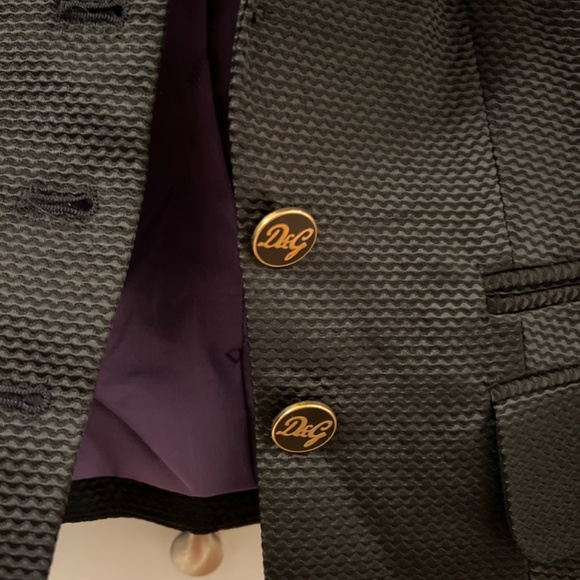 Beautiful short blazer , missing one button. Size is 22/36 European, black with purple lining