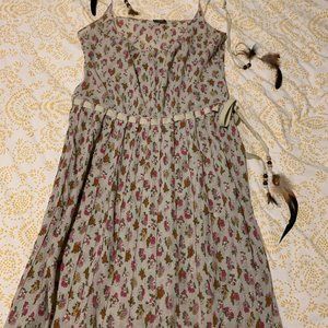 The floral pattern is delicate and incorporated neutral colors that go well with everything. Suede straps are completely adjustable (just need to tie them up) and have beads and feathers at their ends. There also is ad adjustable suede waist cord that can be tied up with a ribbon or knot.