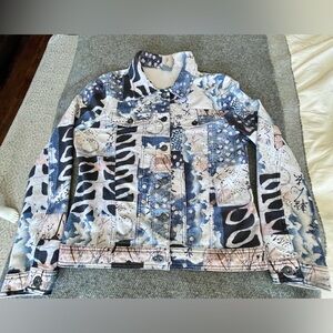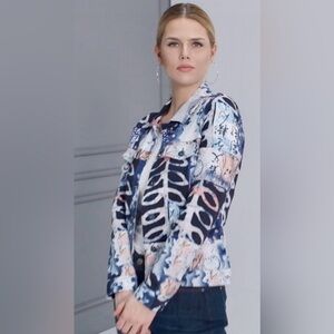 Rare Simply Art by Dolcezza Jacket "Papers" in size Small. Stunning cotton-blend jacket featuring artistic design of Carol Leigh’s painting (front and back) in blue tones, front buttons, pockets, long sleeves, comfortable flattering fit, stretchy.