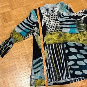 Elevate your style with this multicolor abstract top. Featuring a unique design with shades of black, blue, and yellow, this top is perfect for making a statement. Ideal for casual outings or adding a pop of color to your wardrobe. Hiden buttons all the way