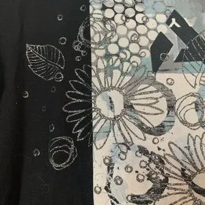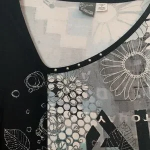 The colours are so nice blues blacks whites along with some sparkling embellishments thin material very soft and stretchy