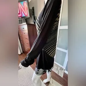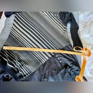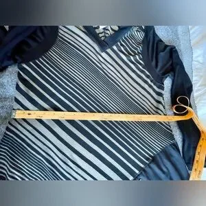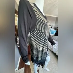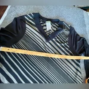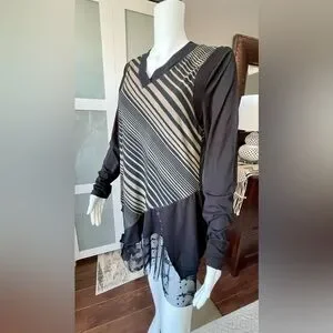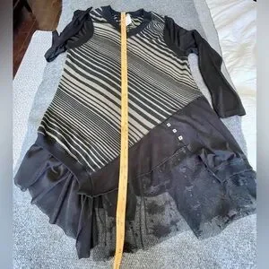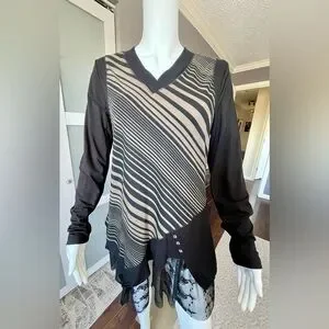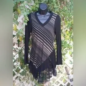 This Dolcezza tunic can be worn with leggings or jeans. The stock picture shows it with an extra lace undergarment and doesn’t come with that. It features a stylish black and beige unique design striped pattern. With lace trims. Perfect for any occasion, it combines comfort with fashion-forward style. In very good pre-owned condition. In size XL. See measurements in pictures. From a smoke free home & not exposed to pets.