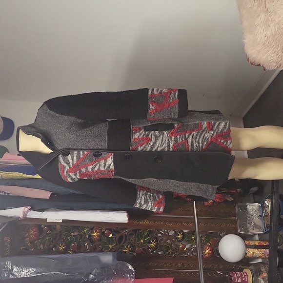 size small. long button up sweater. pockets. 80% wool. 20% polyester. thick. measurements are in the pictures. p1
