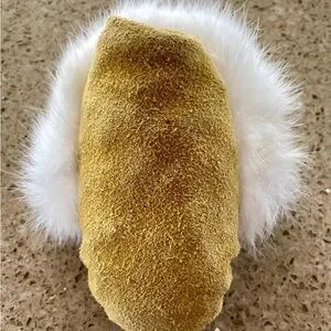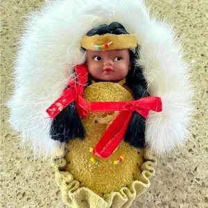 Charming indigenous doll with a yellow outfit and white fur trim. Features red ribbon accents.